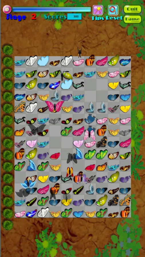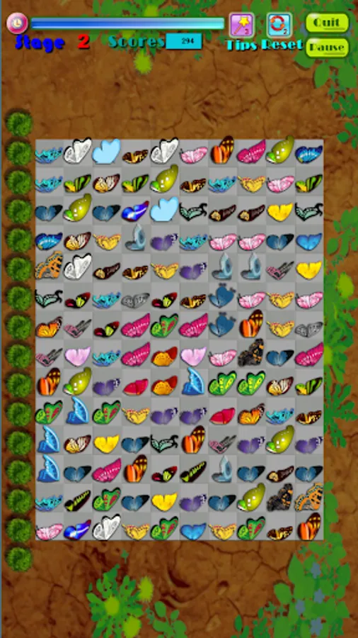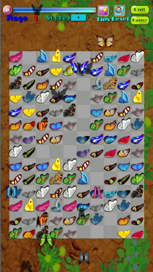 Tap on a butterfly wing and find a matching tile to combine it with. You can only match the tiles if a line can be drawn between them. This line may not run through any other tiles and may not make more than two ninety-degree turns. The only exception is two identical tiles that are lying directly next to one another: you can combine these without drawing a line.
