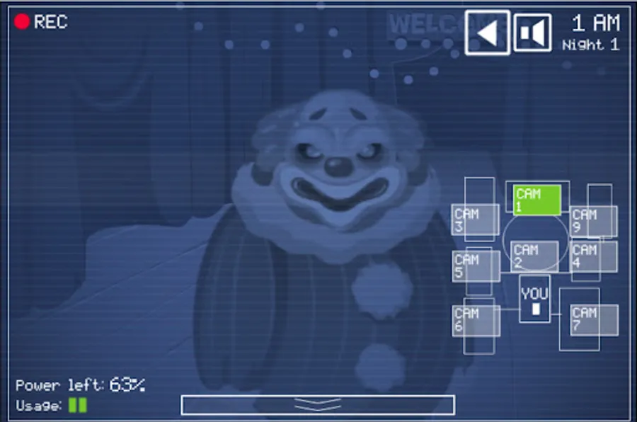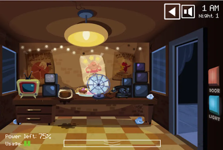 They advised me to get a job in the circus. They assured me it would be interesting. If only they knew what you were up against! Your goal in this game is to pass five and 7 nights to 6 am without getting caught by clowns. To play this game, all you need is a mouse. To use the camera and see where the clowns are, click the arrow at the bottom of the screen. You can also scroll through the guard room by clicking on the screen. You cannot leave the room as this is the only safe position in this location. To turn on the light, click the light button, and to lock the door, click the open button. But proceed with caution. You have to wait until 6 am to save energy and now it is 12 pm, a difficult night is just beginning.