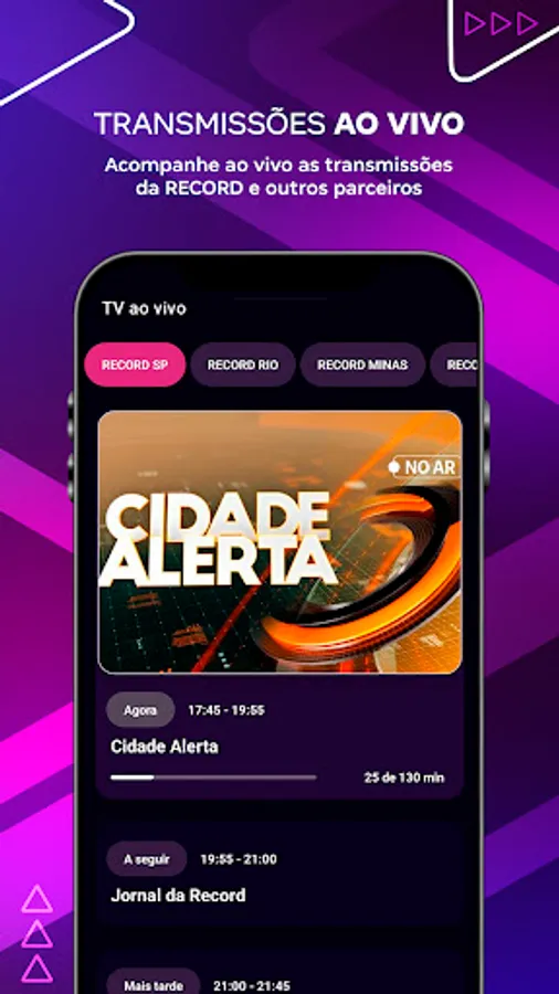 - Full coverage of Record's soap operas, series, reality shows, entertainment programs, and journalism;