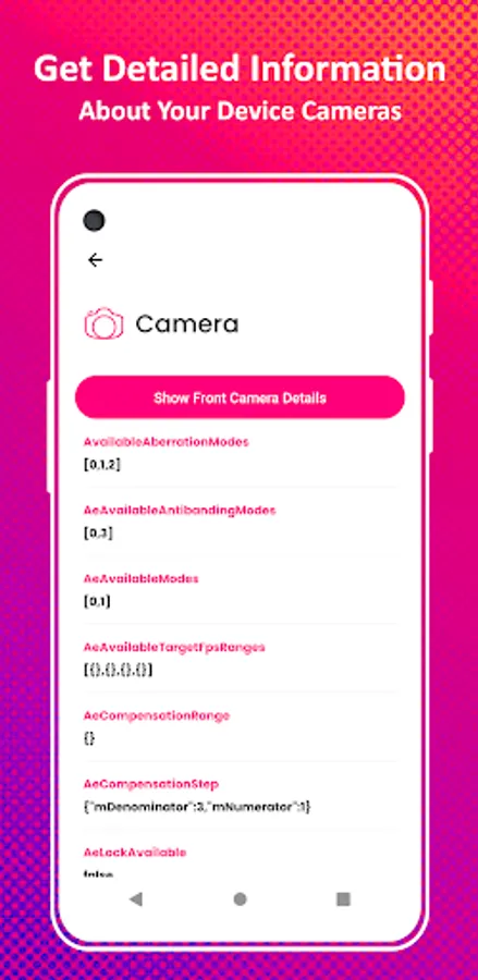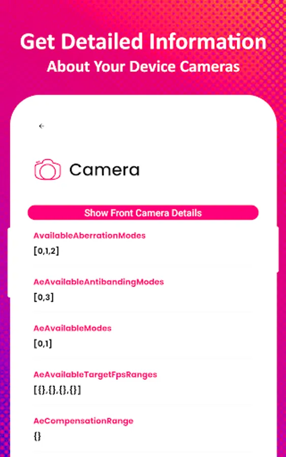 Camera: Get information about both Camera’s MegaPixel, Orientation, Anti Banding, Color Effect, Flash Mode, Focus Mode, White Balance, Focal Length, Focus Distances, Vertical and Horizontal View Angle, Preview FPS Range, Supported Picture Sizes and Supported Video Sizes and many more