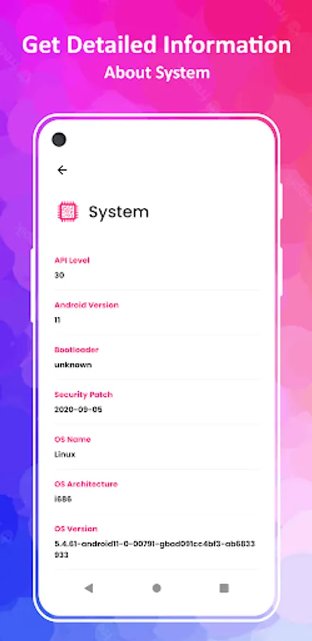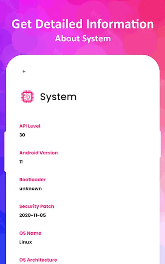 System: Get information about API Level, Android Version, Bootloader, OS Name, Version and Architecture, JVM Name, Vendor, Version, Security Patch, Root Access and System Uptime and many more
