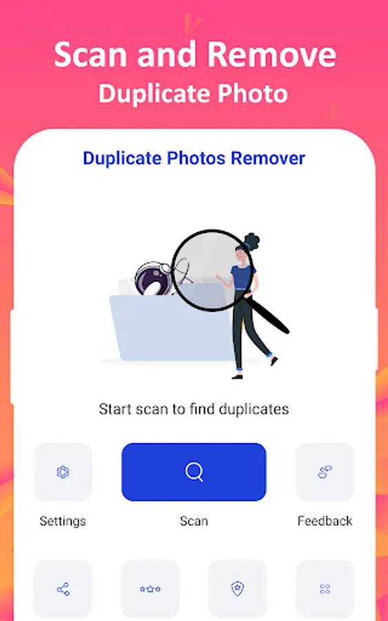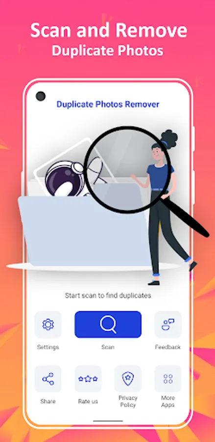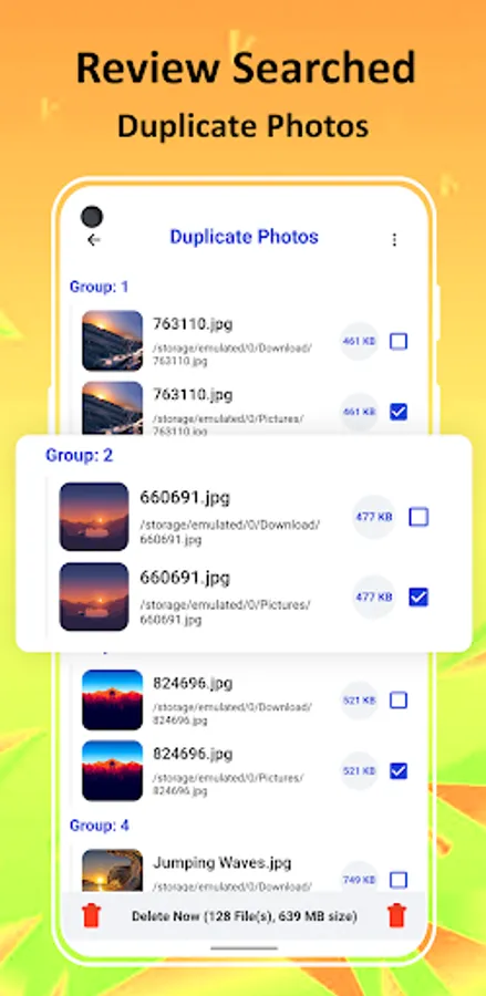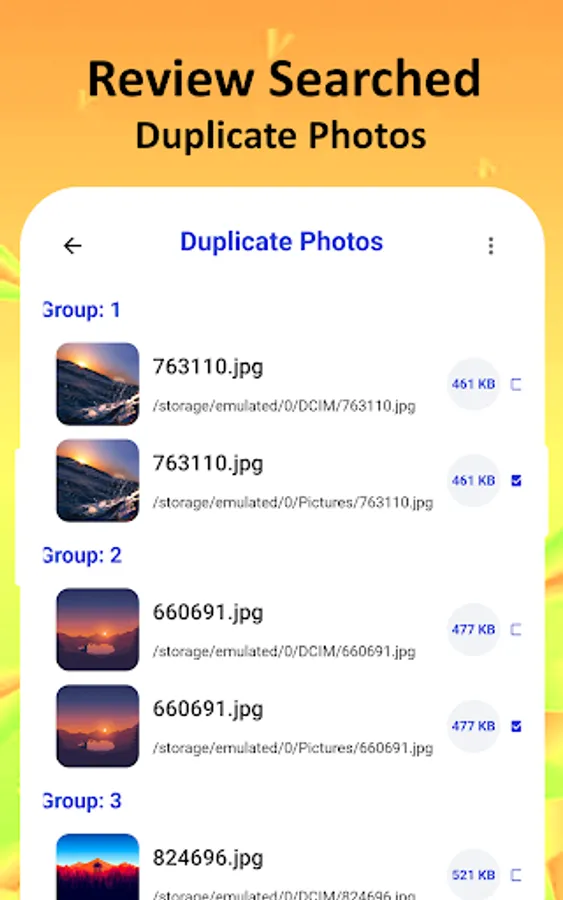 “Duplicate Photos Remover: Storage Space Optimizer” is a powerful duplicate media cleaner app and a perfect solution for you. It intelligently scans and discover the identical and duplicate jpg, jpeg, png, bmp and gif type photos in your mobile phone. This duplicate media cleaner app gives you a fully detailed view of the identical photos and images in the form of group with complete details like their paths in memory and the sizes they occupied on your phone storage. It tells you the total number of duplicate photos found and the total size they occupied on your phone and lets you select or unselect photos and delete them permanently from your phone and optimize the storage space.