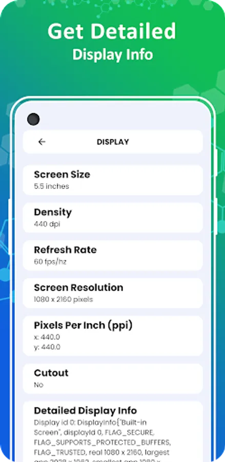 Get detailed raw information about the display of your mobile phone or tablet device.