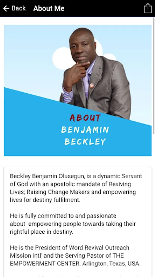 Welcome to the Official Mobile App platform of Benjamin Beckley, a visionary, agent of empowerment and destiny value adder. He is the President of Word Revival Outreach Mission and Lead Pastor of the church arm - THE EMPOWERMENT CENTER. A Church fully committed to empowering lives for destiny fulfillment....