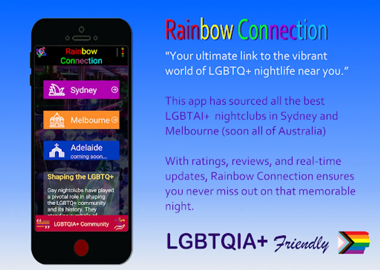 Are you ready to unlock a vibrant world of LGBTQIA+ nightlife in Melbourne and Sydney, Australia? Look no further than Rainbow Connection, the groundbreaking app designed to connect you with the most inclusive and exciting venues in these iconic cities. Whether you're a local or a visitor, Rainbow Connection is your passport to unforgettable experiences and unforgettable connections.