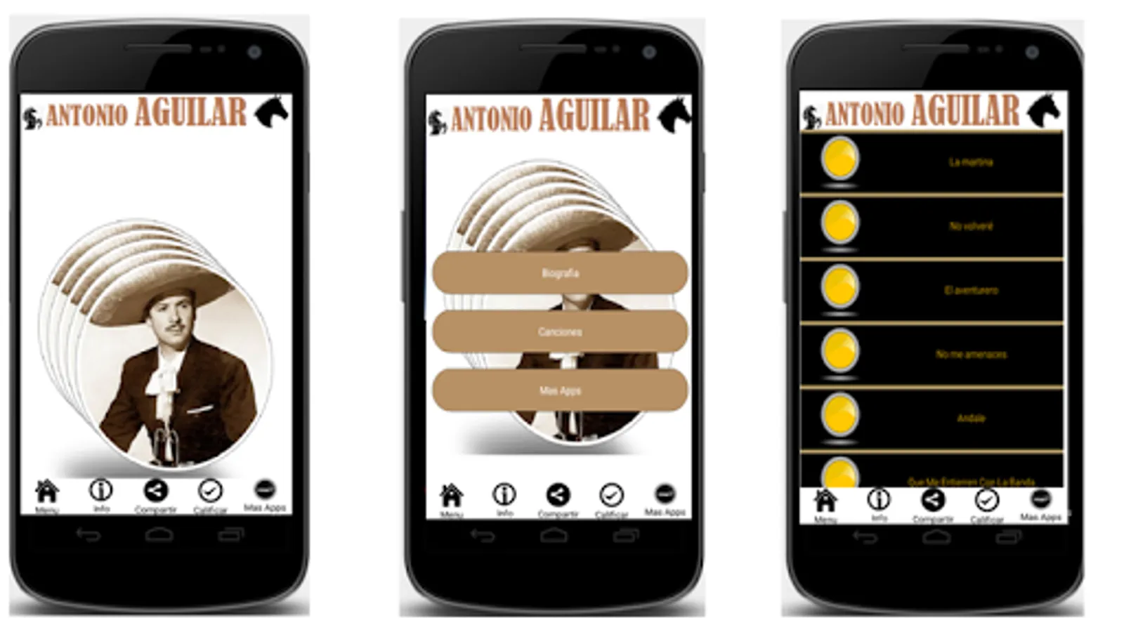 ANTONIO AGUILAR - MUSIC. The ""Charro de México""- Free App, He is considered a legend of Mexican popular music and recognized for promoting charrería internationally, and that is why he is nicknamed "El Charro de México". He toured the world on various tours with his wife, the also singer and actress Flor Silvestre, and their children Antonio Aguilar Jr. and Pepe Aguilar. He is recognized as the person who gave a great boost to the sport and Mexican talent of charrería at a national and international level.