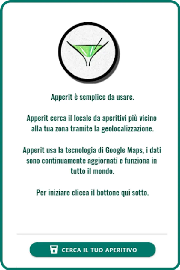 Apperit the "look for aperitifs" helps you to find the closest place to the area where you are that offers the aperitif service. Apperit uses Google Maps technology. The data is continuously updated and works all over the world.
