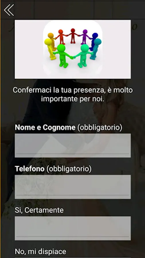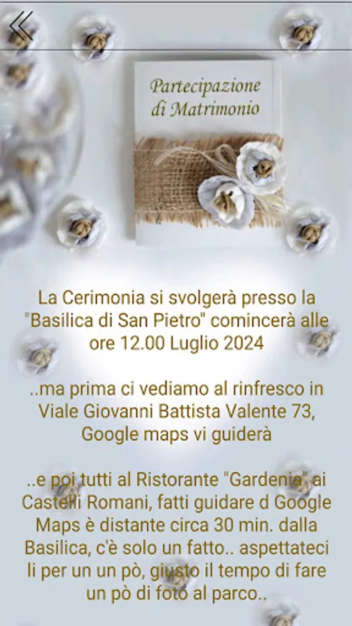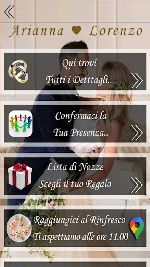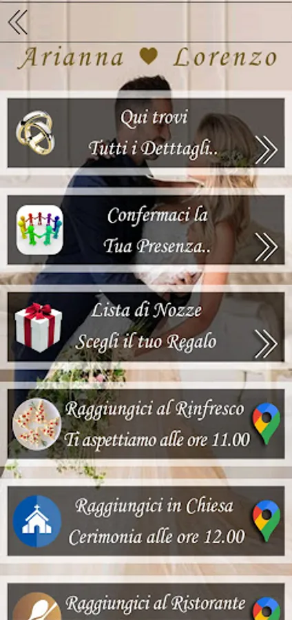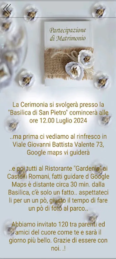 This App is only demonstrative and contains all the information about your most beautiful day to share with your guests. If you like this format, contact the developer SB Studio will be tailor-made for you.