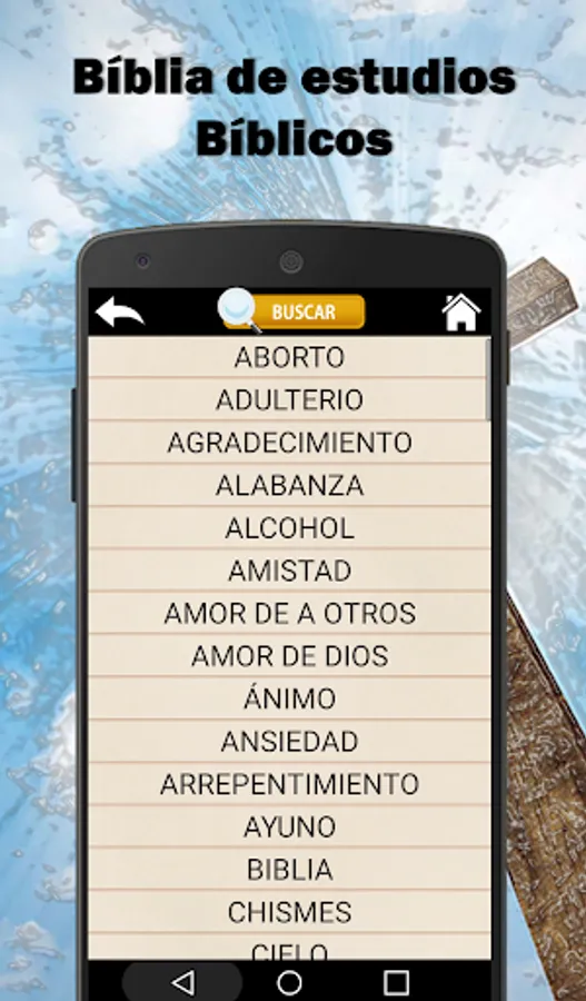 - biblical themes: divided into a number of items ranging from abortion to the new life, through such varied topics as alcohol, friendship, depression, divorce, homosexuality, lust, obedience, patience, loneliness or temptation. In each of them you can read a verse from certain points of the sacred books of Christianity.