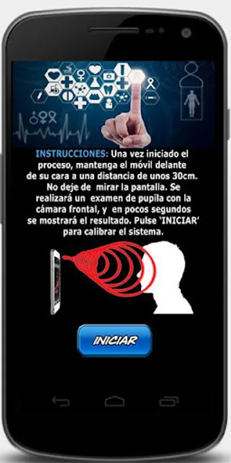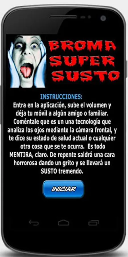 JOKE aimed at your friends and family. Enter the application, turn the volume up and leave your mobile. Tell them that it is a technology that analyzes the eyes through the front camera and tells you your current state of health or anything else you can think of. It's all LIE, of course. Suddenly a horrifying face will come out screaming and take a terrifying scare. Perfect for halloween or the day of holy innocents.