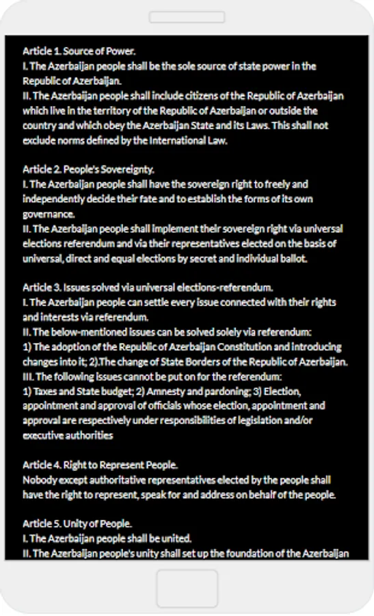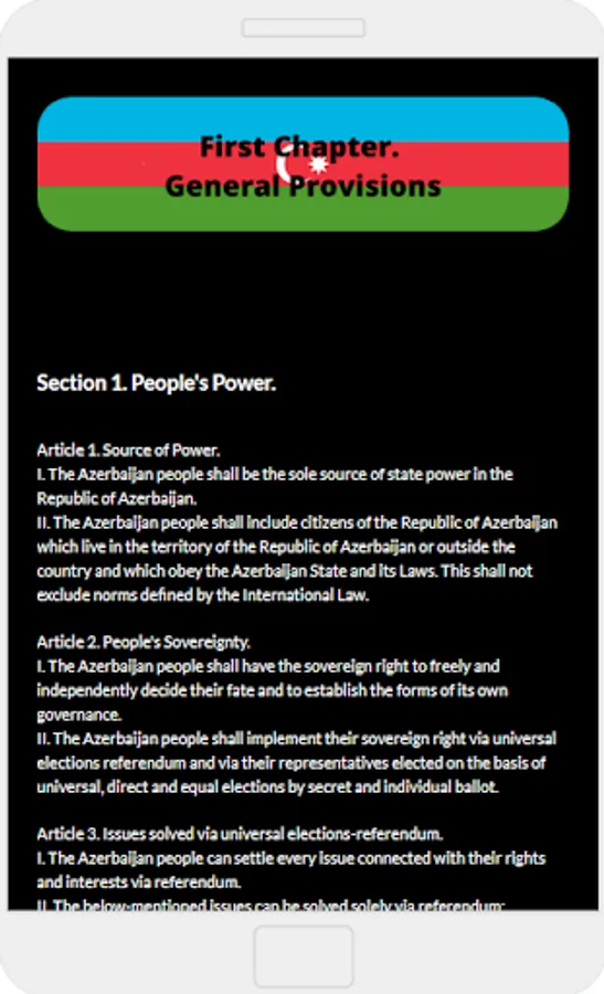 The first Constitution of independent Azerbaijan consists of 5 chapters, 12 sections and 147 articles. It was amended on 24 August 2002 and again on 18 March 2009. It carries the "highest legal force" in Azerbaijan as per article 147.The most recent amendments to the Constitution were approved after the Constitutional referendum held on 26 September 2016. In 2002, 31 amendments were made to 22 articles; in 2009, 41 amendments were made to 29 articles; and in 2016, 23 articles were amended and new 6 new articles were added.