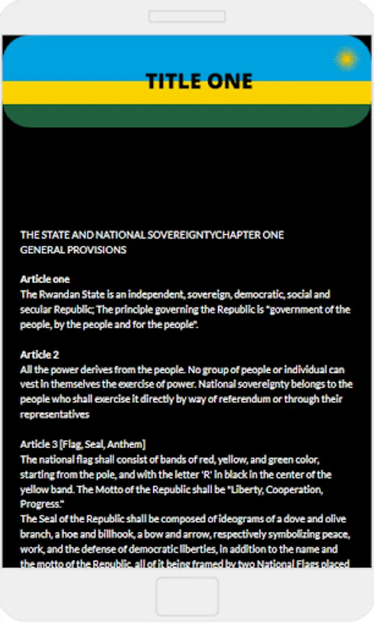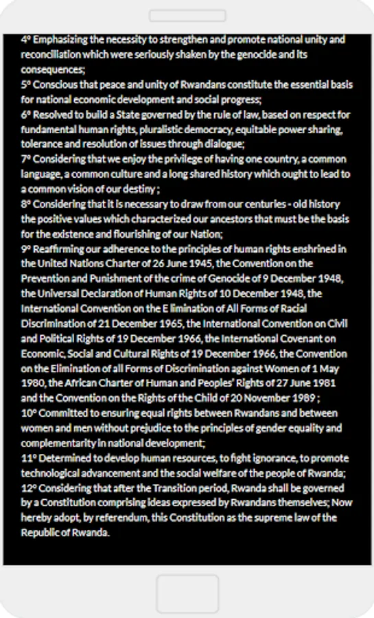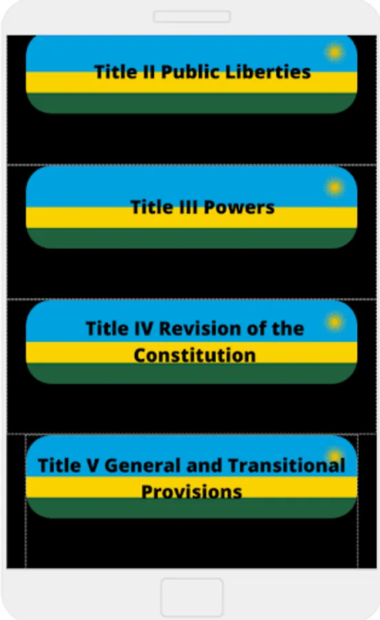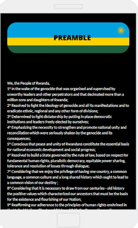 The Constitution provides for a presidential system of government, with separation of powers between the three branches. It condemns the Rwandan genocide in the preamble, expressing hope for reconciliation and prosperity.