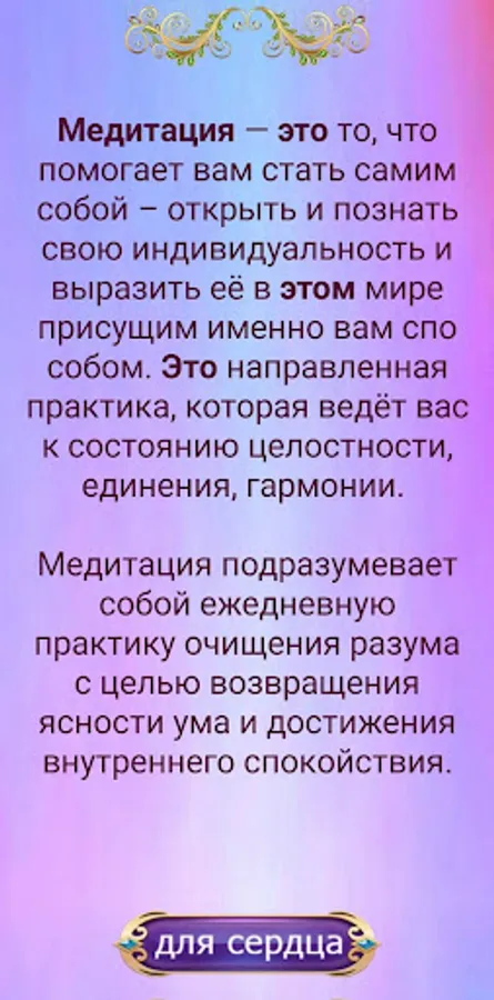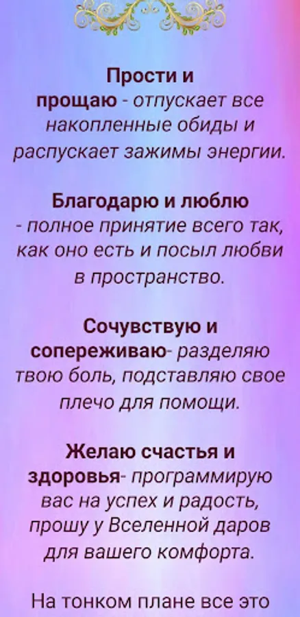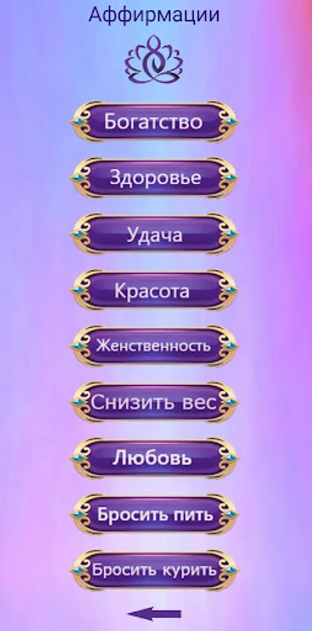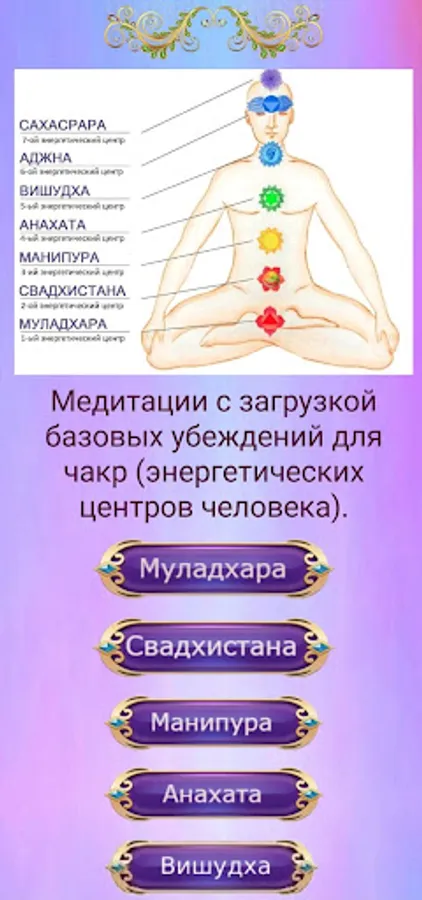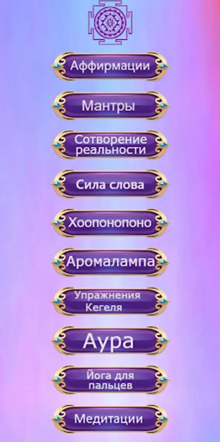 The application contains female filling practices, recipes for aroma lamps, prayer for transformation, video meditation, cleansing aura, video meditation for chakras (human energy centers) om hilling, yoga for fingers, Kegel exercises, audio meditation for effective weight loss.