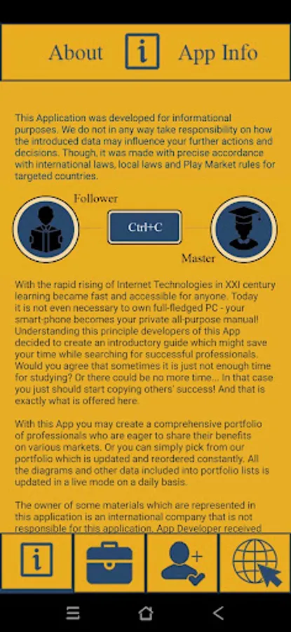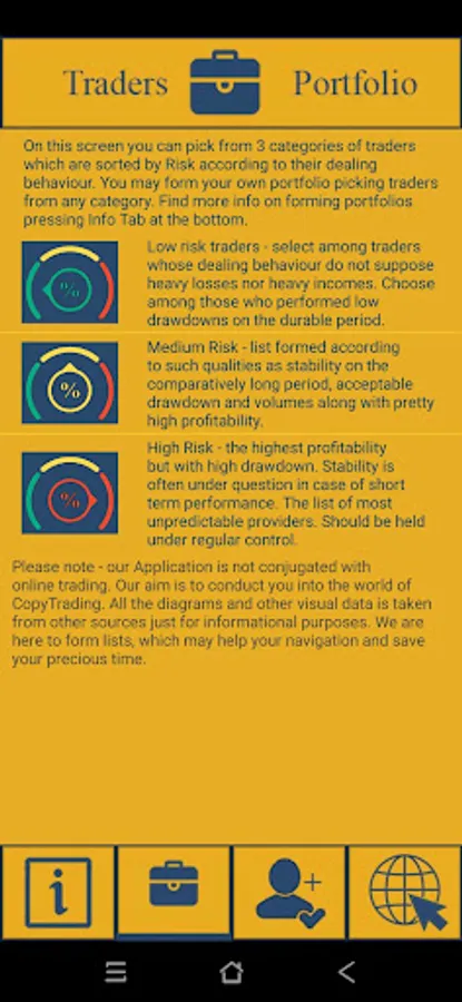 While interacting with this App you may use some web-recources provided by represented CopyTrading website. This website does not belong to developer of the application and all of such recources are represented with conset from their owner according to the public offer agreement for informational purposes.