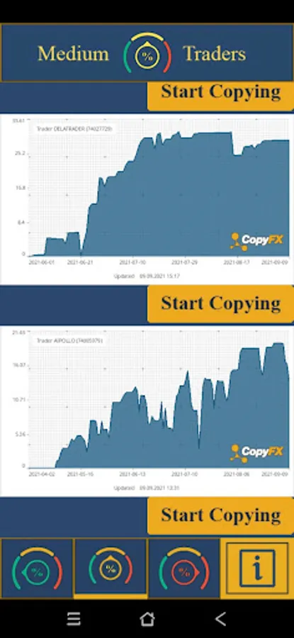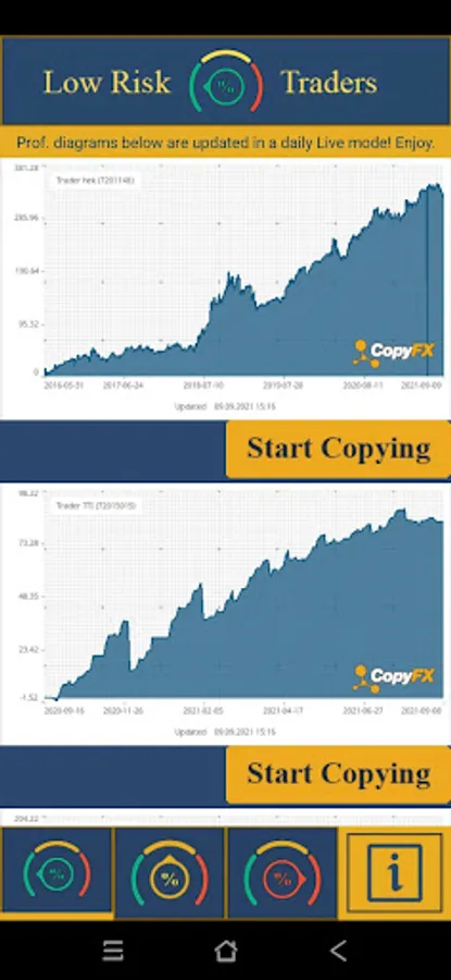 This light introducing application was developed to help you start online copying of deals on various markets. Running this tutorial app you may access one of the most reliable and comprehensive copytrading service, open accounts and form your optimal portfolio of professional traders. If you trust the developer's analytical skills you may use our trader portfolios which might safe a lot of your precious time. All the diagrams and other data used in CopyTrading App are updated in a live mode on a daily basis.