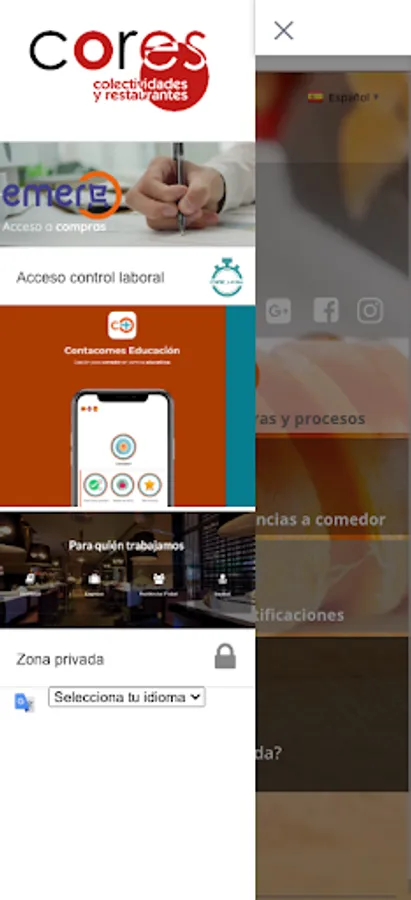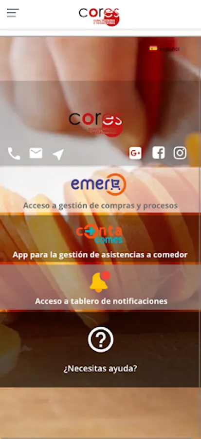 With our Cores app, you can access different sites according to your needs. If you are our cook or employee, you can access "Emere" and place an order, manage an entrance or reception or compose menus. It will also be possible to access the "Contacomes" app without having to download more apps and if your center is a member of Cores, you will be able to see how your child eats or add attendance to the dining room easily and quickly. You can also access online help or access our direct contact. And the most important thing is that we will dynamically modify the information or accesses and we will inform you of everything through push notifications with attachments and links through the virtual board of the app.
