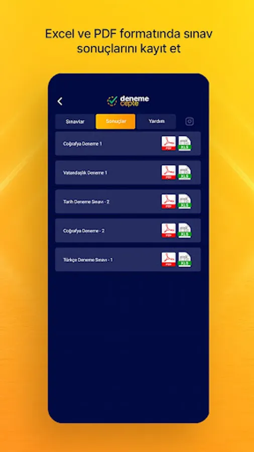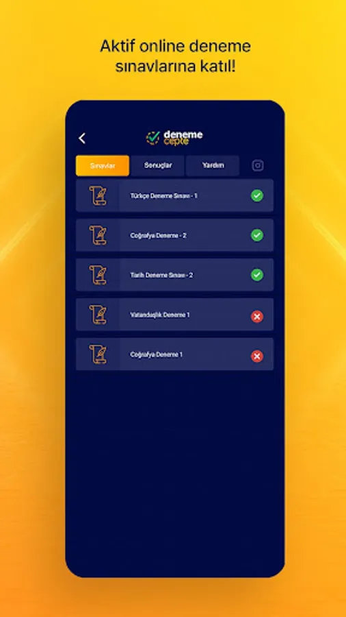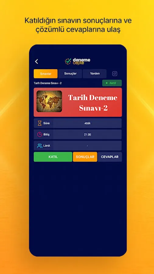 You can find quizzes and results in the main section of the application. When the test notification comes, you can take the exam from the application. When your exam is over, you can send the exam to the examination and see your general ranking after a while.