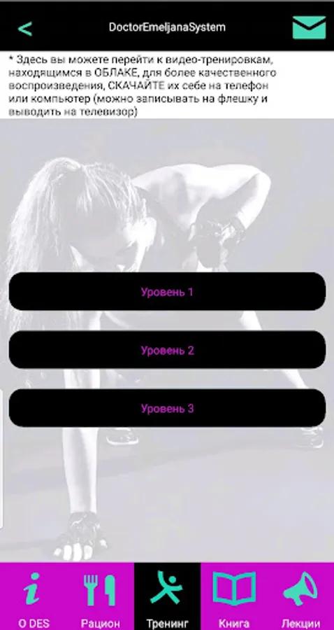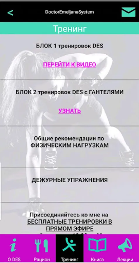 2. TRAINING DES. Nine 30-minute intense home fat burning workouts from Katerina Emelyana to work out different zones of three difficulty levels - "Plug and repeat!" Also, general recommendations for physical activity and duty exercises.