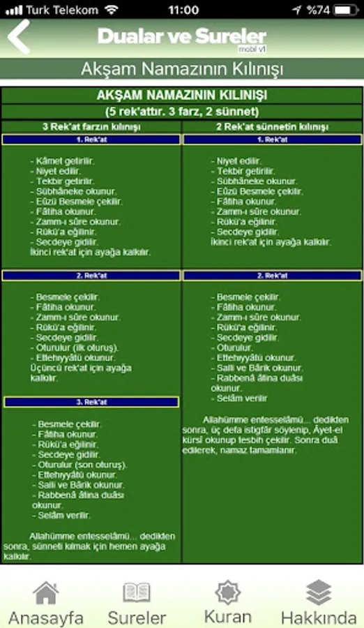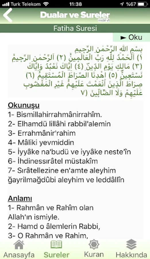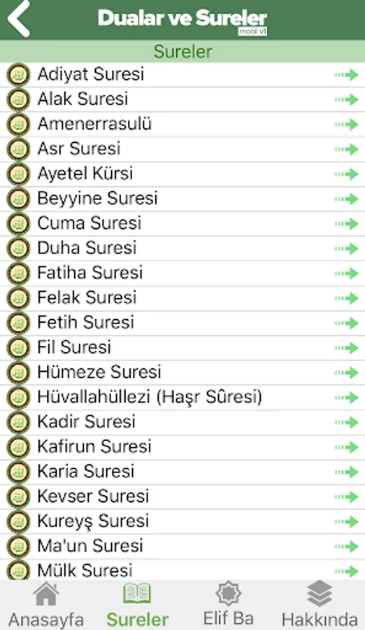 Prayers to be read during prayer and their Turkish meanings are listed. You can listen to the reading of the audio by selecting the time you want to learn from the Surah menu. In the Surah module, there are 36 written Surah in Arabic, the Turkish translation and the reading of the voice. The suras are voiced to be listened and followed easily and comfortably.