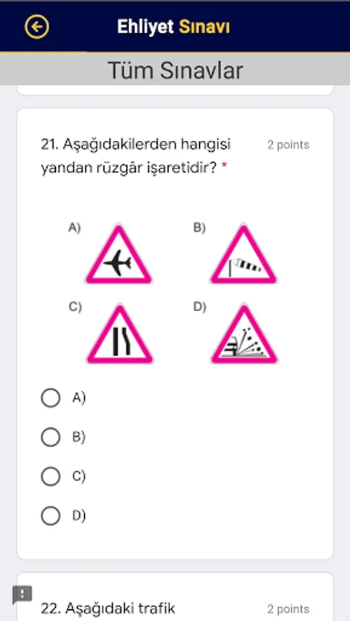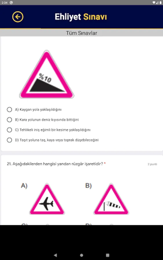 You can prepare for the exam by solving the 2021 Driver's License exam questions without applying. The questions in the application were created by choosing from the driver's license exams. It is suitable for the e-exam syllabus!