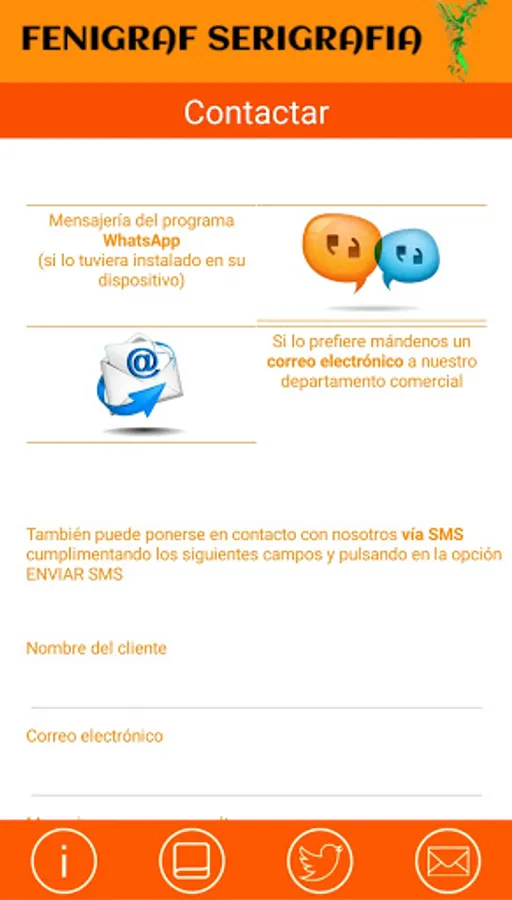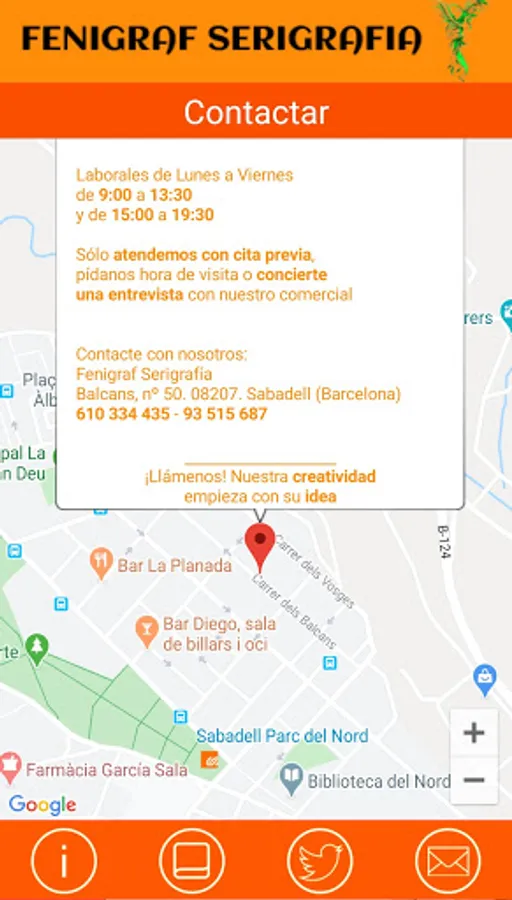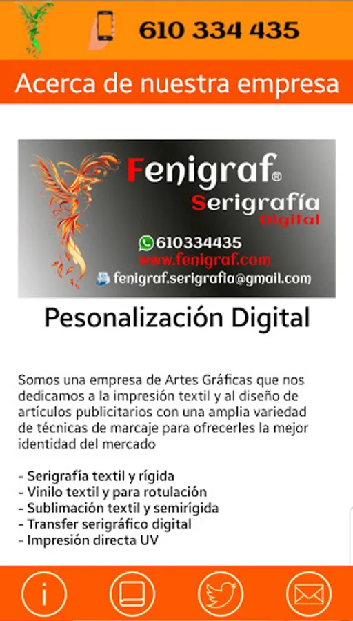 Fenigraf Serigraphy, as an Fem jocs application, manages the structure of the values and the services offered by our company, from the main screen, showing visual aspects such as: