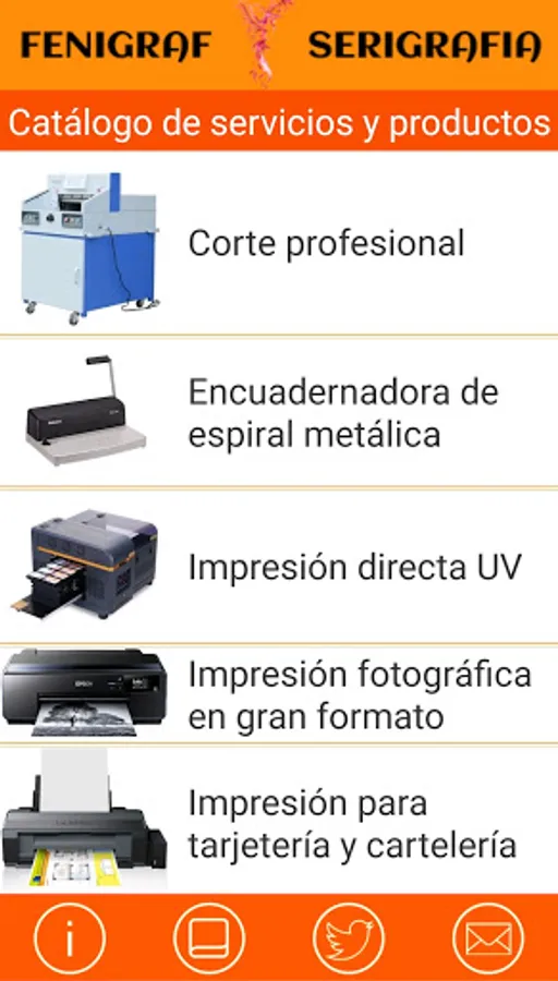 The Catalog of services and products , which will show the different high-printing services we focus on and their specifications by clicking on them from the icon represented by a book.