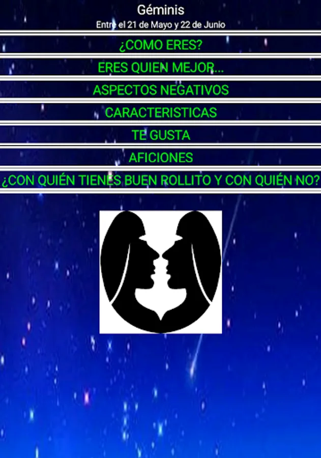 With this complete application you will be able to know the characteristics of each sign of the zodiac, how are you, your hobbies and the degree of compatibility with other signs.