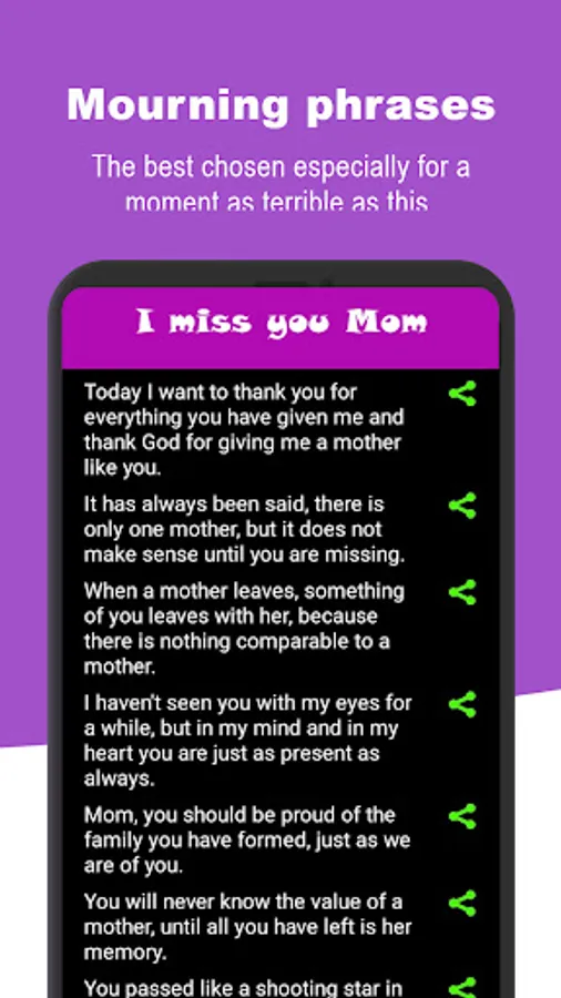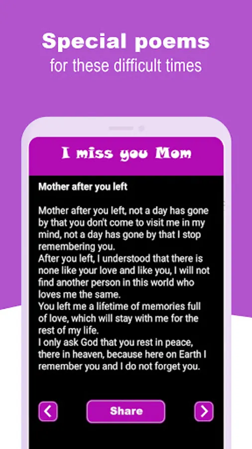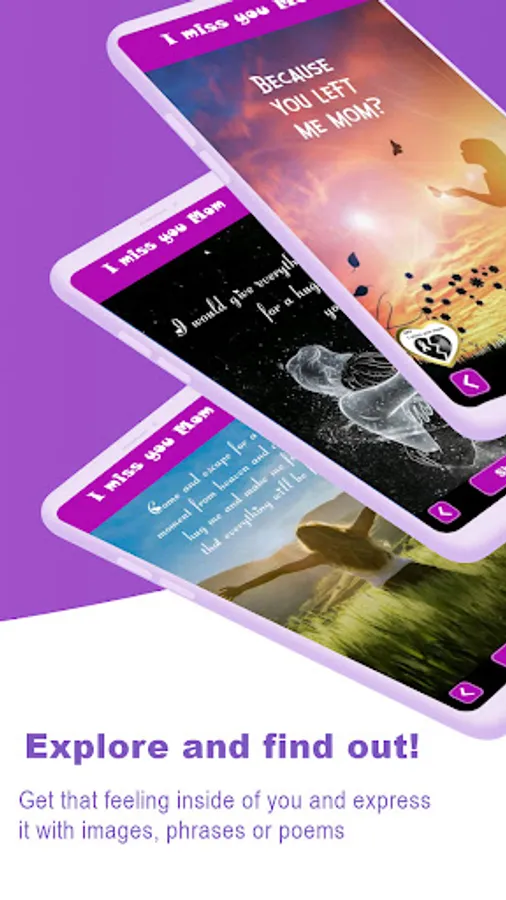 "I miss you Mom" is an app dedicated to that being as special as the mother and that even after death, her mark is immeasurable, so we show you a series of images, phrases and poems that will help you express those feelings of sadness that you carry inside and thus vent from so much pain.