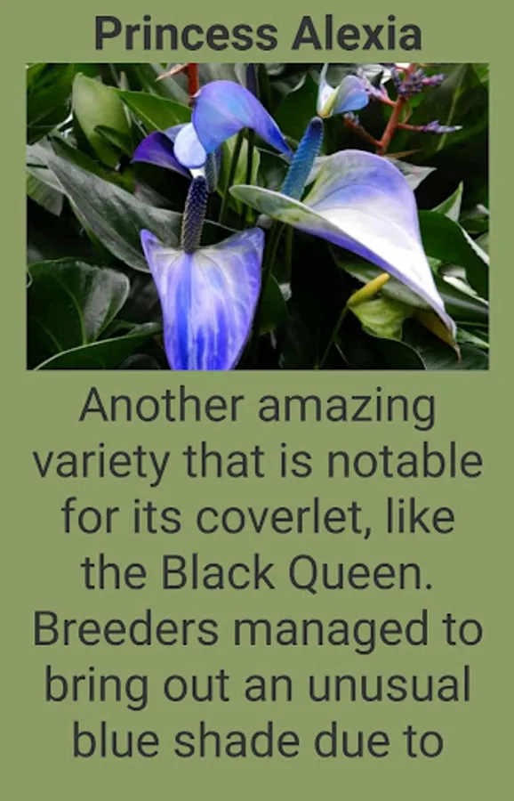 Mysterious Anthuriums is an application that offers users a unique opportunity to get acquainted with various types of anthuriums. The application contains an extensive collection of different varieties and colors of anthuriums. In general, this information is for all plant and flower lovers who want to decorate their home or garden with unique and beautiful anthuriums.