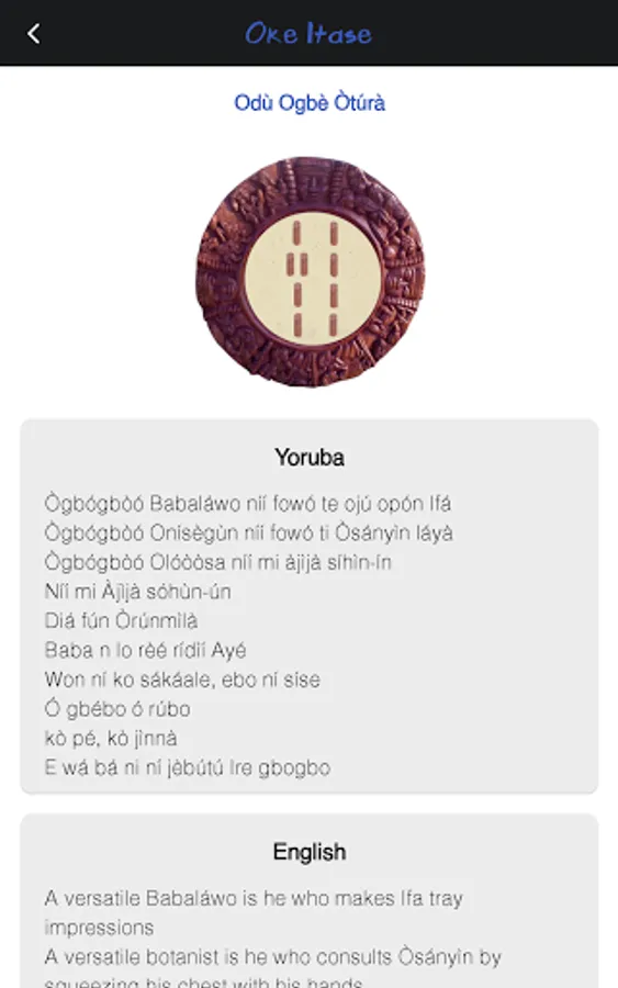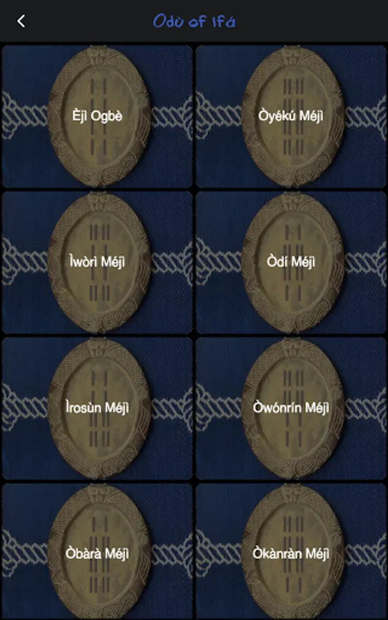 Ojú Odù is the first application with verses of the 16 main Ifá signs from Eji Ogbe to Ofun Meji with audios in Yorùbá to improve your knowledge of traditional practice.