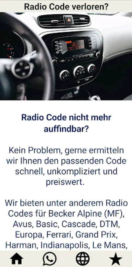 We offer radio codes for models such as Becker Alpine (MF), Avus, Basic, Cascade, DTM, Europe, Ferrari, Grand Prix, Harman, Indianapolis, Le Mans, Mexico, Marathon, Monaco, Monte Carlo, Monza, Nissan, Online, Porsche, Solitude, Traffic, Mercedes, Audio 5 10 30, Bose, CD, Classic, CM, Exquisit, Sound 10 20 30, Special, Truckline and many more.