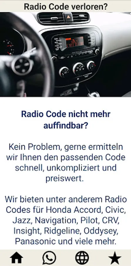 We offer radio codes for models such as Honda Accord, Civic, Jazz, Navigation, Pilot, CRV, Insight, Ridgeline, Oddysey, Panasonic and many more.