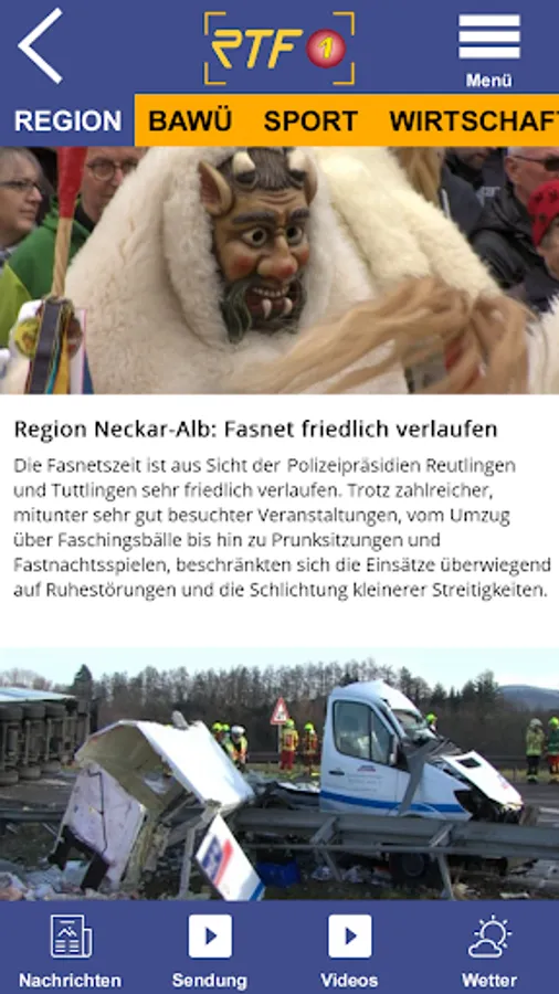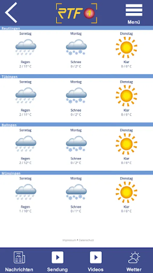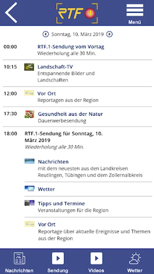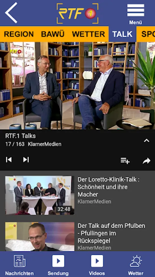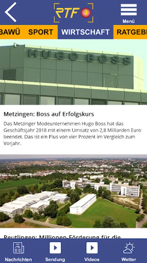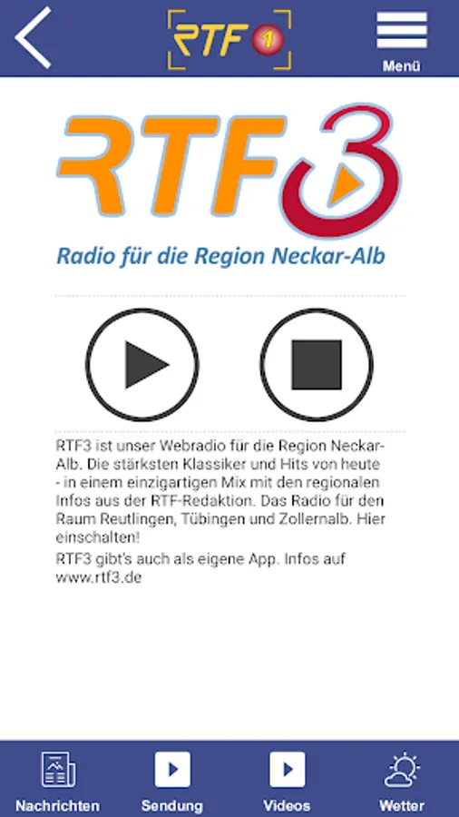Videos and news from the region Neckar-Alb from RTF1 Regional TV. Watch our daily broadcast on demand. News and service for the region Reutlingen, Tübingen and Zollernalb: Events, politics, business, sports, weather, talks. News from Baden-Württemberg. Also: RTF3 Radio for Reutlingen, Tübingen and Zollernalb as livestream.