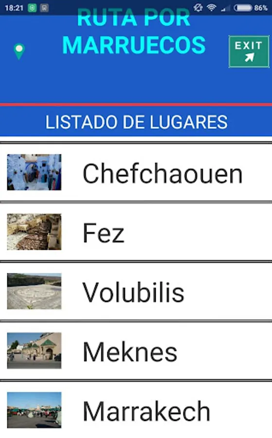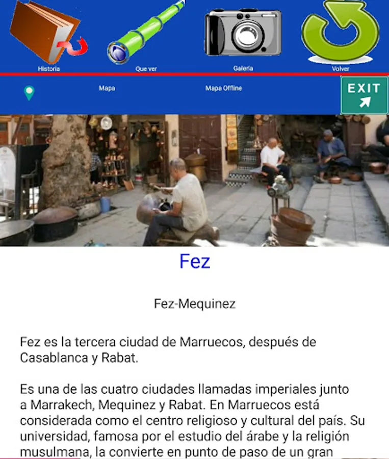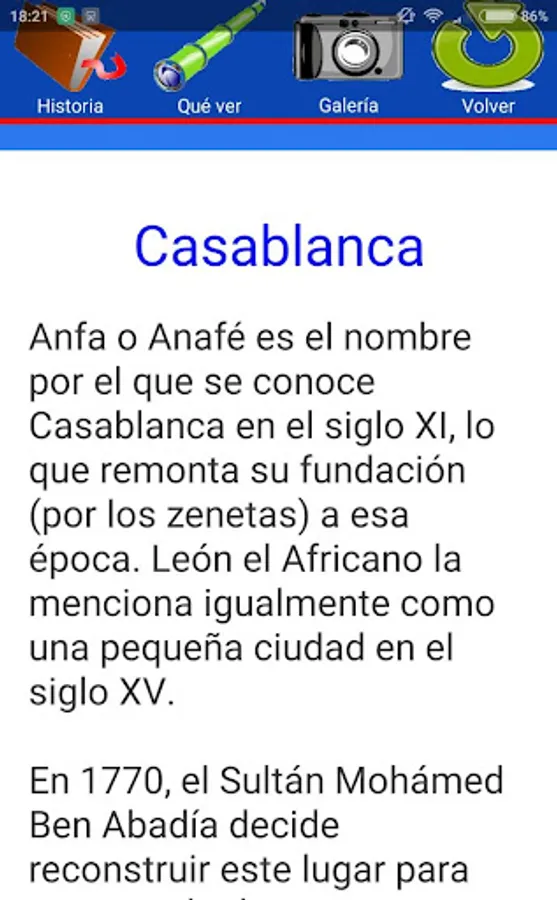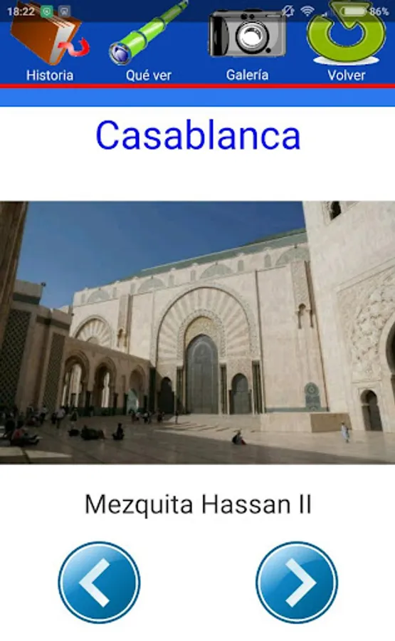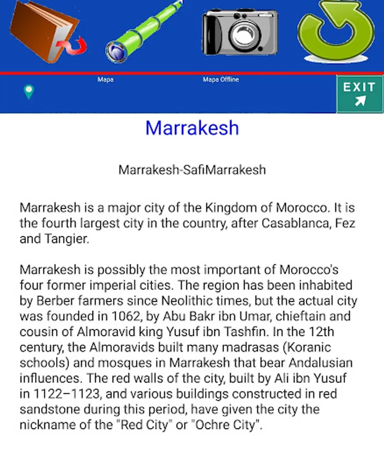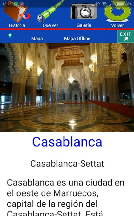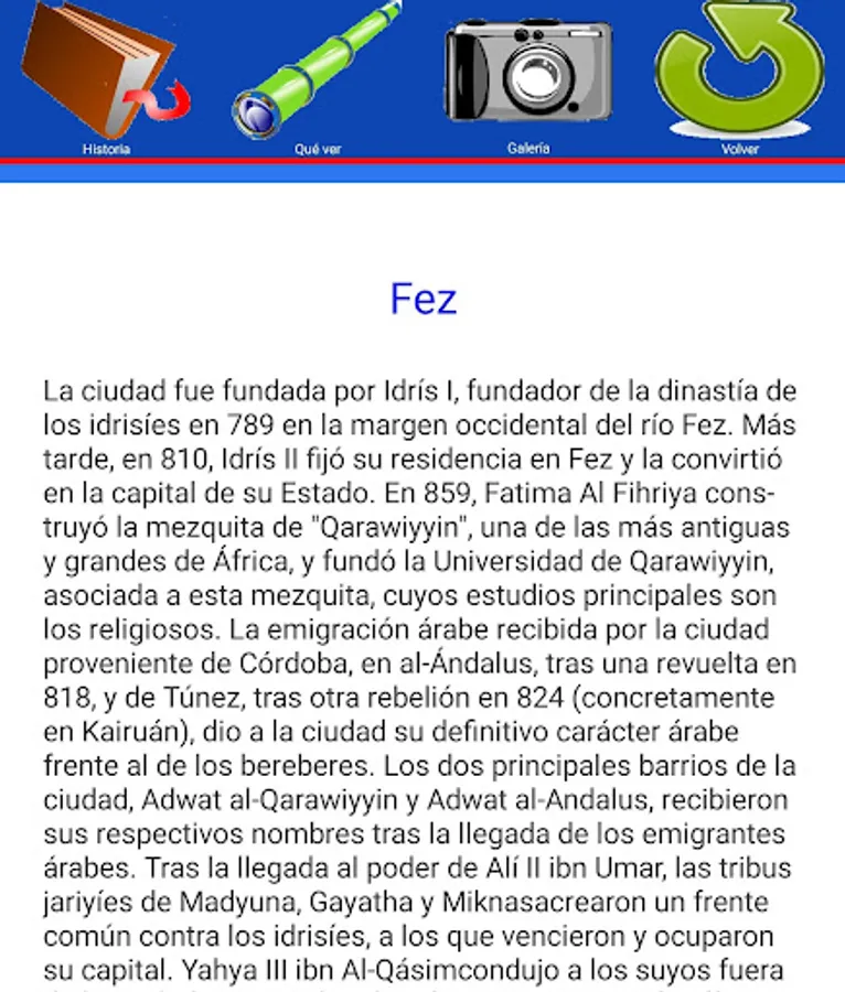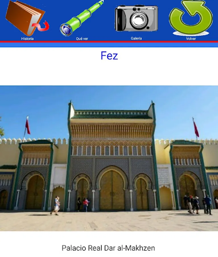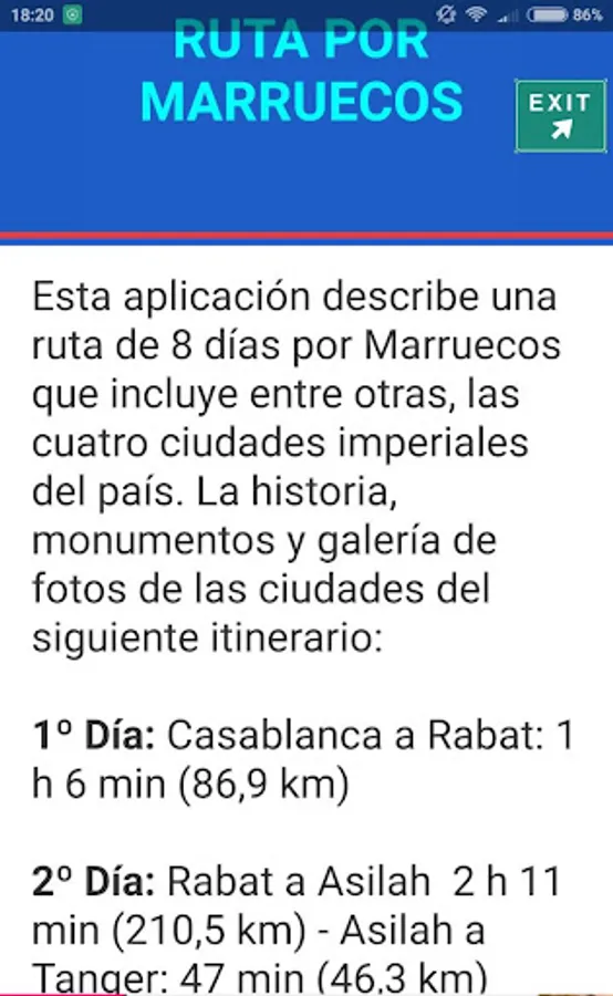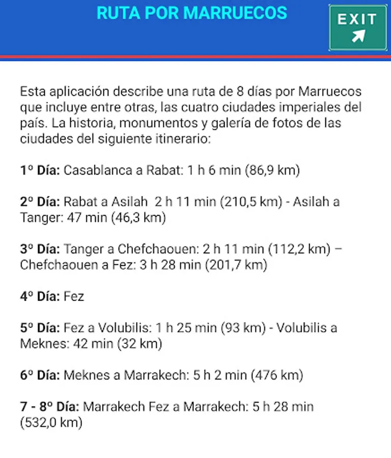 This application describes an 8-day route through Morocco that includes, among others, the four imperial cities of the country. The history, monuments and photo gallery of the cities in the following itinerary: