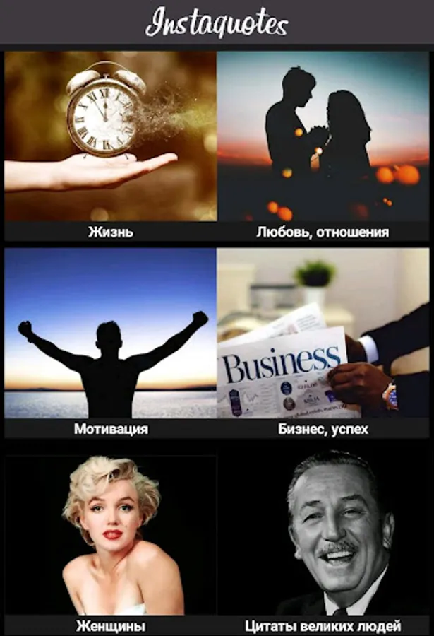 * Quotes are divided into headings: quotes about life, love and relationships, women, and also - motivation, business, success and quotes of great people.