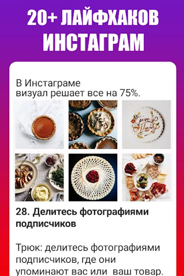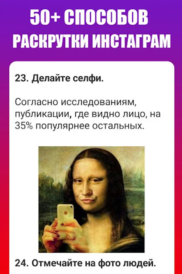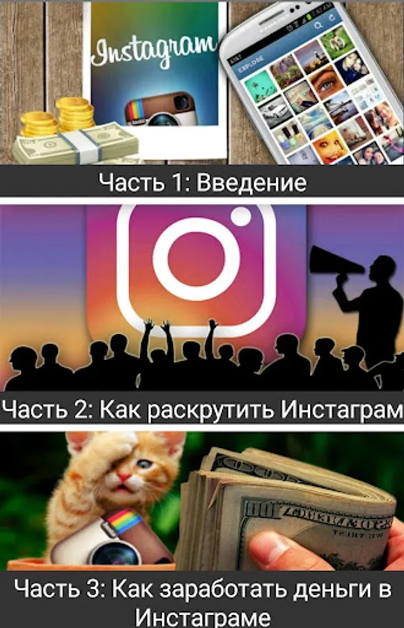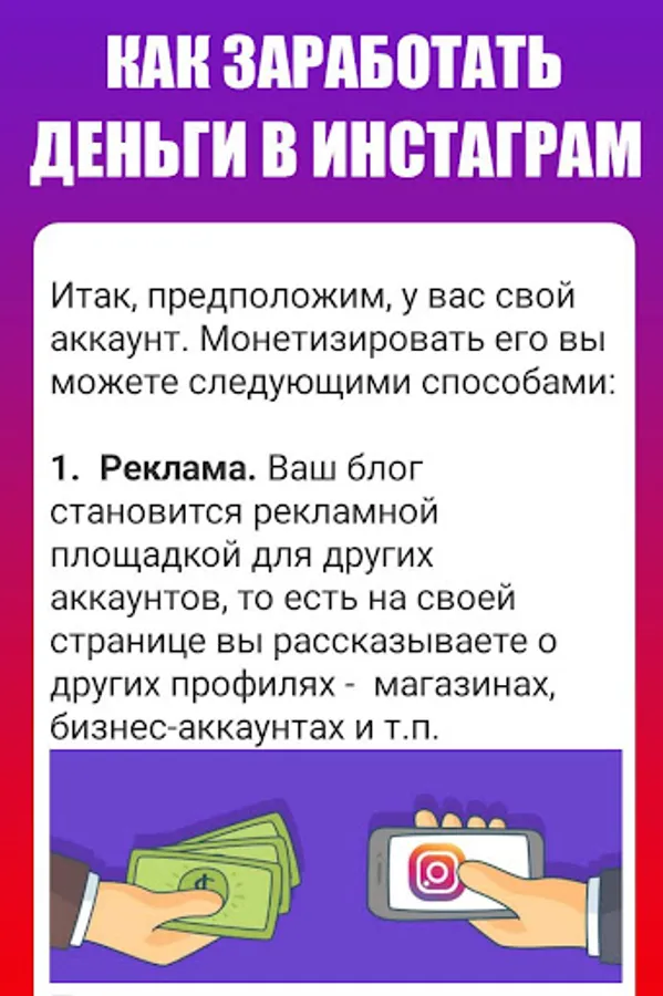 The application will help and tell you what and how to do in order to collect followers, get promoted and start making money on Instagram.