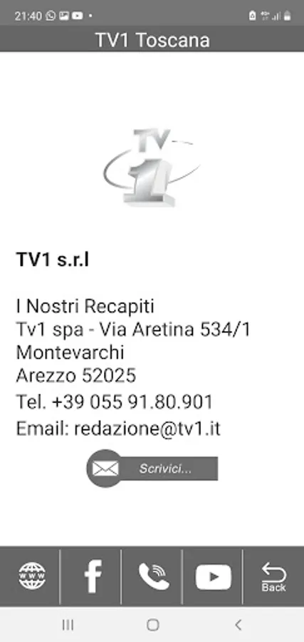 The Tv1 Television Group has its headquarters in Montevarchi (Ar) from where it has been operating continuously since 1986. With the transition to digital terrestrial, it broadcasts television content on 9 channels: Tv1, Grande Italia, Frog, Tv1 News24, Toscana Live, Tv1 Tua , Grande Italia Sport, ArezzoDigital and Tourist Channel representing a reference in the provinces of Arezzo, Siena and Florence.