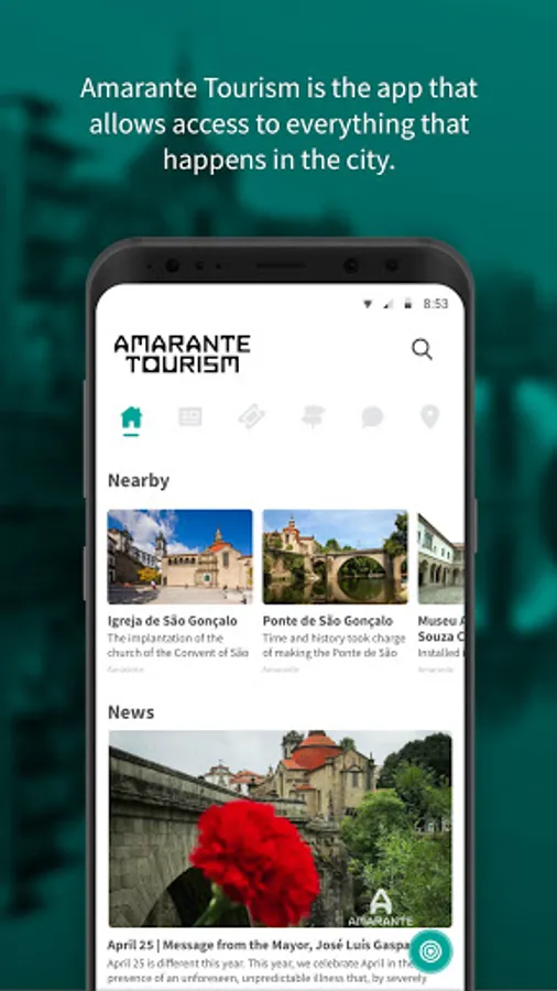 The app AmaranteTourism gives you the chance to choose what you want to know of Amarante and to define the course to follow with the suitable suggestions.