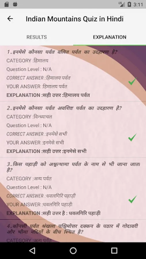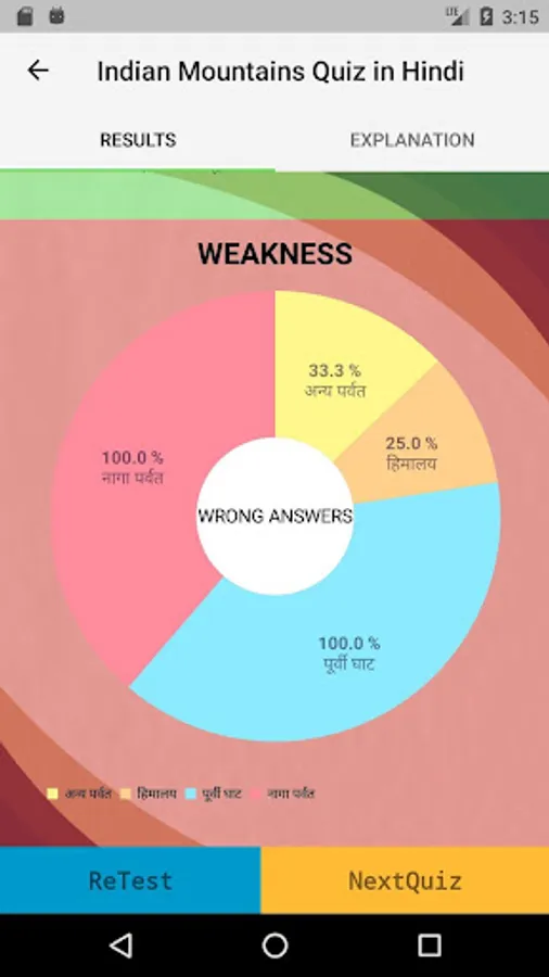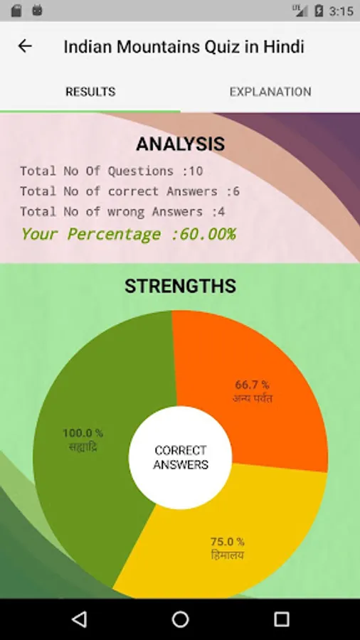 Indian Mountains Quiz in Hindi application consists of 8 different quiz sections, after each quiz set, there is result analysis as per different mountain categories, this will help the user to know his strengths and weakness while preparing for the exam and prepare accordingly.