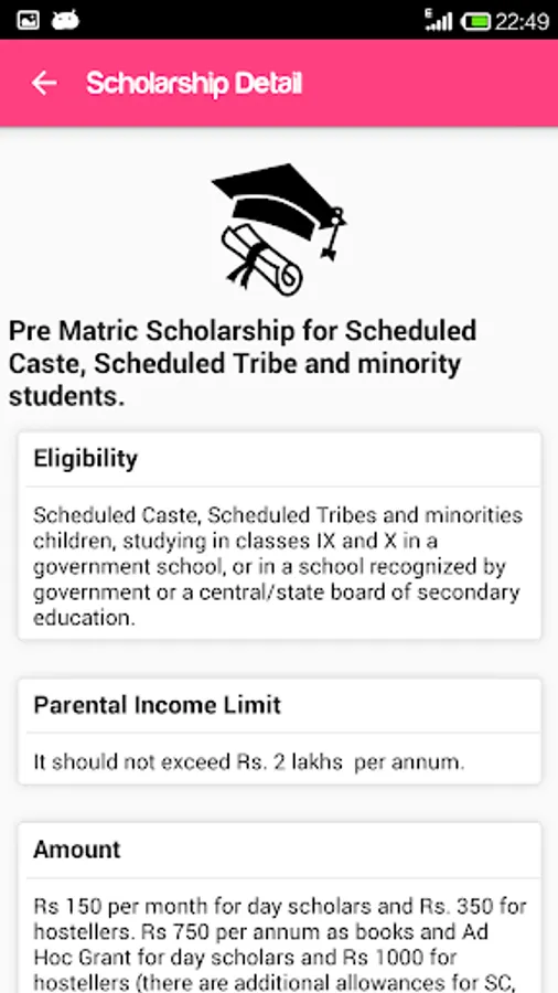 2. Scholarships and Fellowships – The APP has a section on Scholarships, where information on various government and private scholarship schemes are provided. We have covered most of the government scholarship schemes starting from pre-matric to Ph.D. level. The APP has provided information on scholarships available to students from Scheduled Castes, Scheduled Tribes, Women, Muslim Minorities and also general category students. Under each scholarship, the APP provides information on who can be the beneficiaries of the scheme, what is the amount of scholarship and a web link where further information can be accessed.
