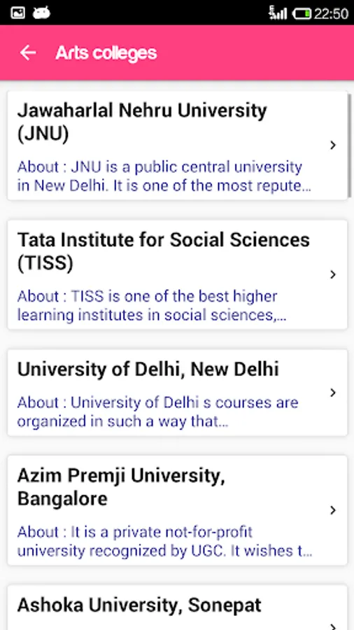1. Colleges – The app has information on the best colleges and Universities in India for 13 streams – Arts, Commerce, Science, Engineering, Management, Law, Computer Science, Fashion Technology, Hotel Management, Fine Arts, Mass Communication, Medicine and Nursing. For each college, we have provided a short introduction, main courses offered, application process and its website link where user can access further information. The information provided is from the official websites of the listed institutions or other public sources like Wikipedia, etc. The APP ranks colleges and Universities based on external independent studies carried out by various media and other sources on institutions for their quality and reputation (e.g. India Today College Rankings and other such rankings available on the internet). The list of colleges is not exclusive or exhaustive and there may be other institutes in addition to the ones mentioned in the list which would be worth applying for.