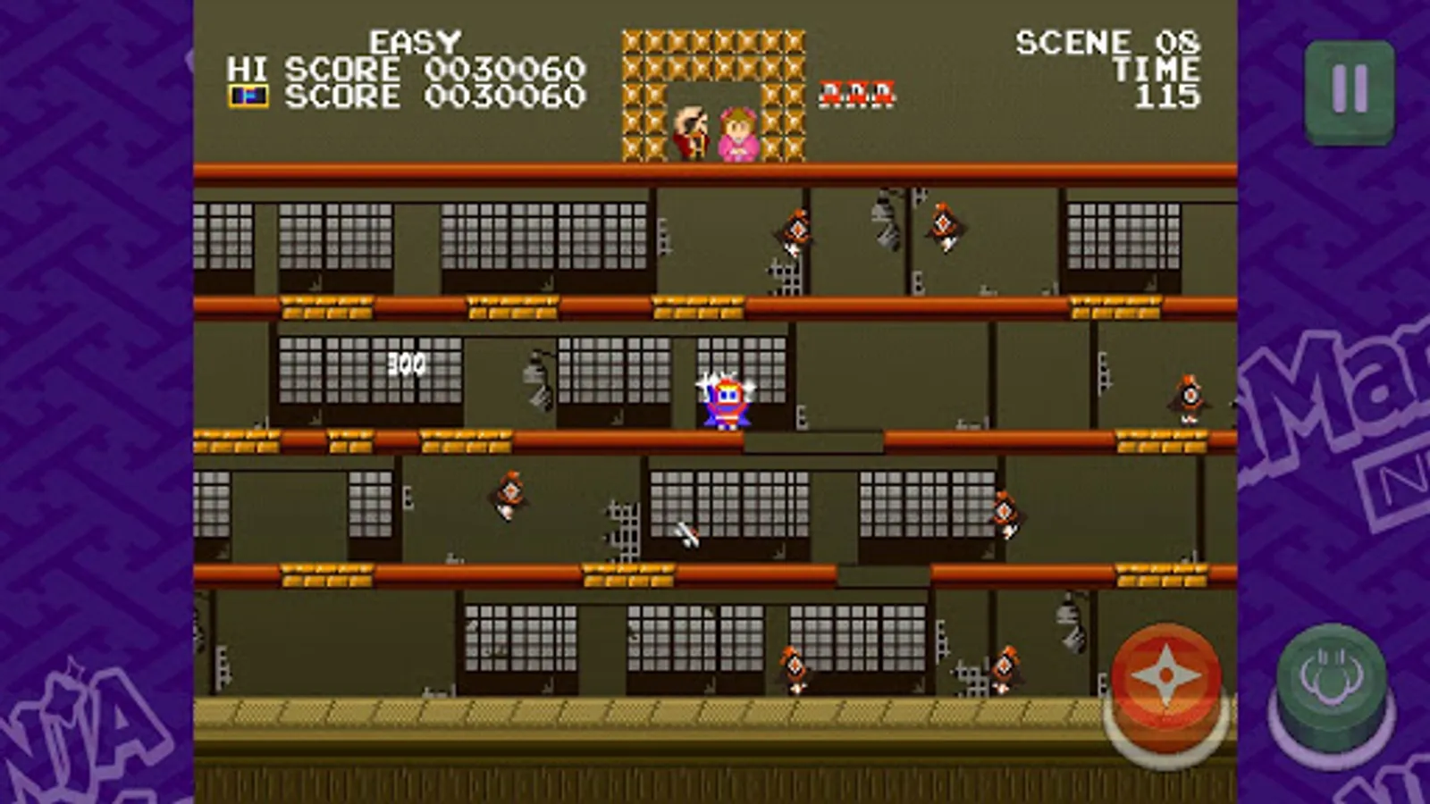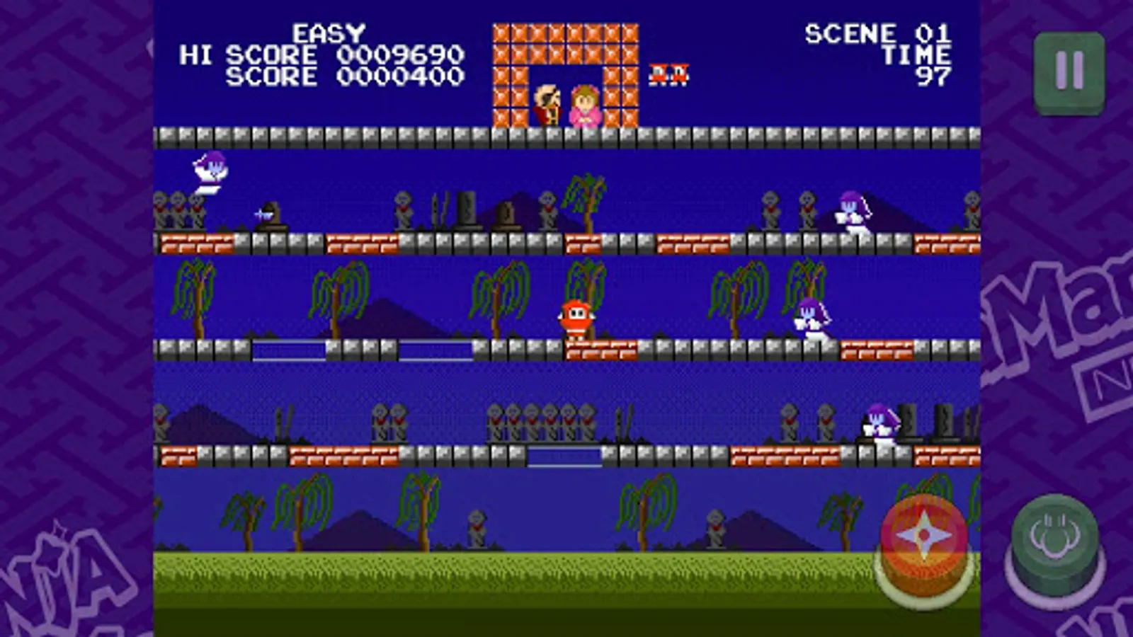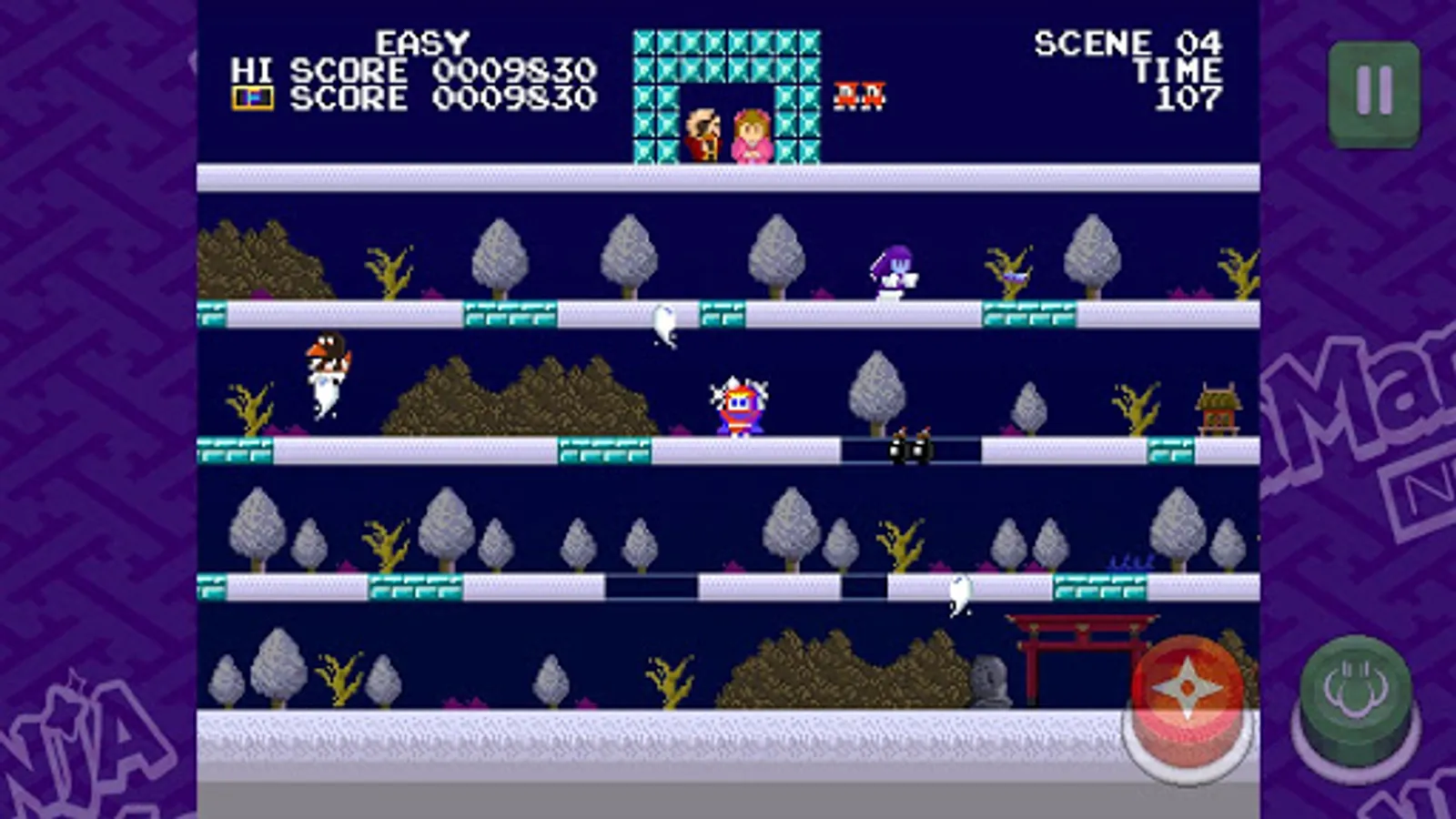 Able to move the Jajamaru by dragging left and right, jump by touching jump button, and shoot Ninja stars by touching Ninja star button. The Ninja star button becomes a downward move button when a toad appears. Ceiling blocks can be destroyed by jumping. Items may appear randomly.
