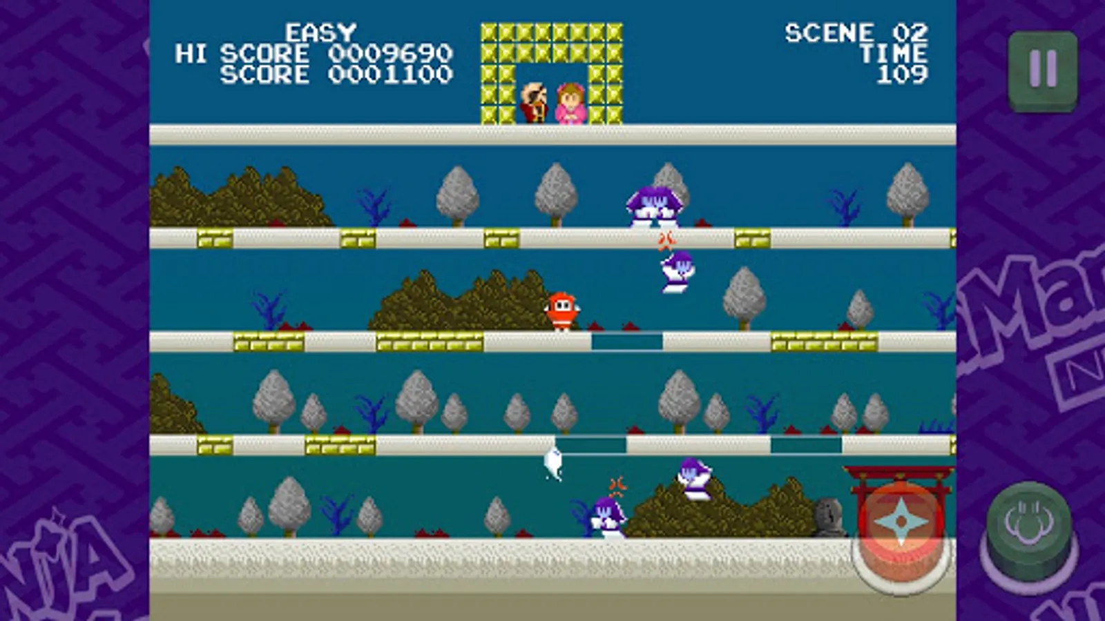 [Ninja Jajamaru], released in 1985, reappeared in mobile. Control Ninja Jajamaru to defeat the monsters and rescue Princess Sakura who was captured by NamazuDayu!