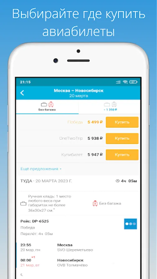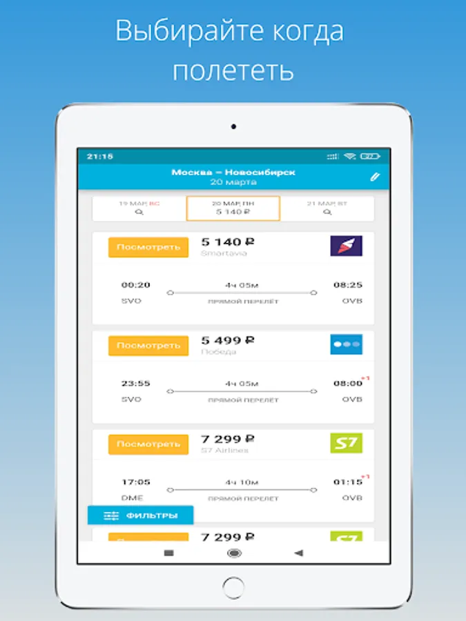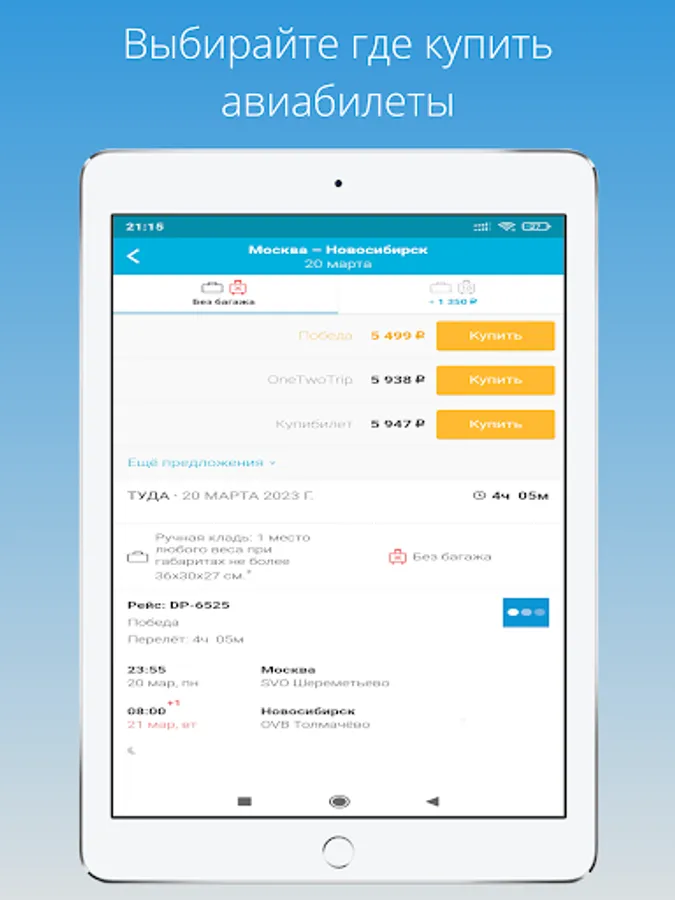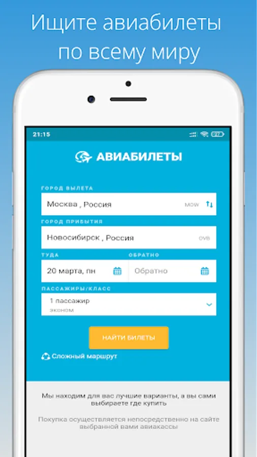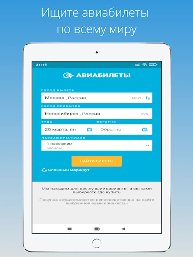 The application will always come in handy - whether you are going on vacation or on a business trip, abroad or in a neighboring city. You can choose from a variety of flight options, as the search is carried out for regular flights, charters, and low-cost airlines (budget airlines).