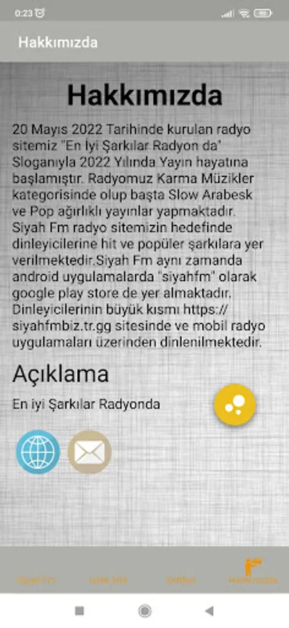 20 Mayıs 2022 Tarihinde Kurulan radyo sitemiz ''En İyi Şarkılar Radyon da '' Sloganıyla 2022 Yılında Yayın hayatına başlamıştır. radyomuz karma müzkler kategorisinde olup Slow Arabesk ve Pop ağırlıklı yayınlar yapmaktadır.