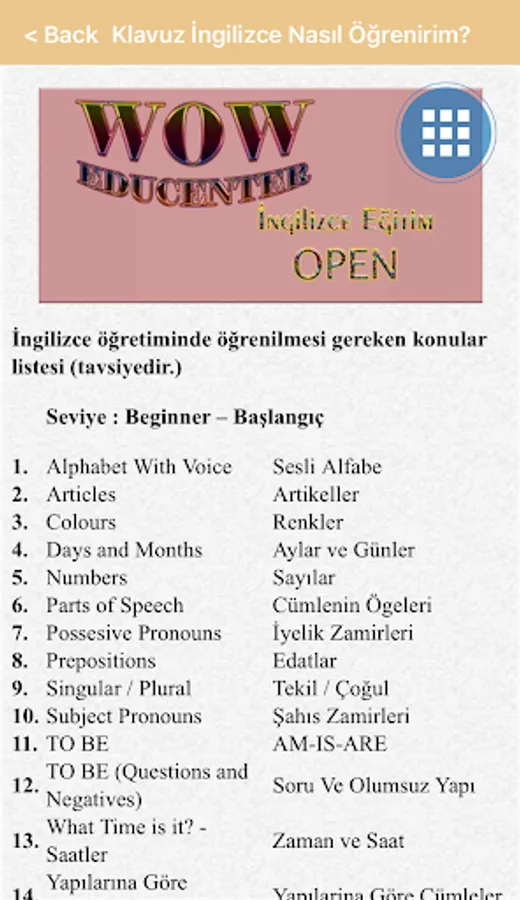 3) Our system supports the current level words selected by using computer technology instead of the usual methods, and allows the grammatical rules to be studied instantly with the help of automatic opening windows. There are no practices that prevent crossing a topic or rule without learning a subject or rule. Adequate Grammar Rules are given in PDF format within the program.
