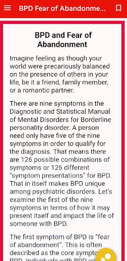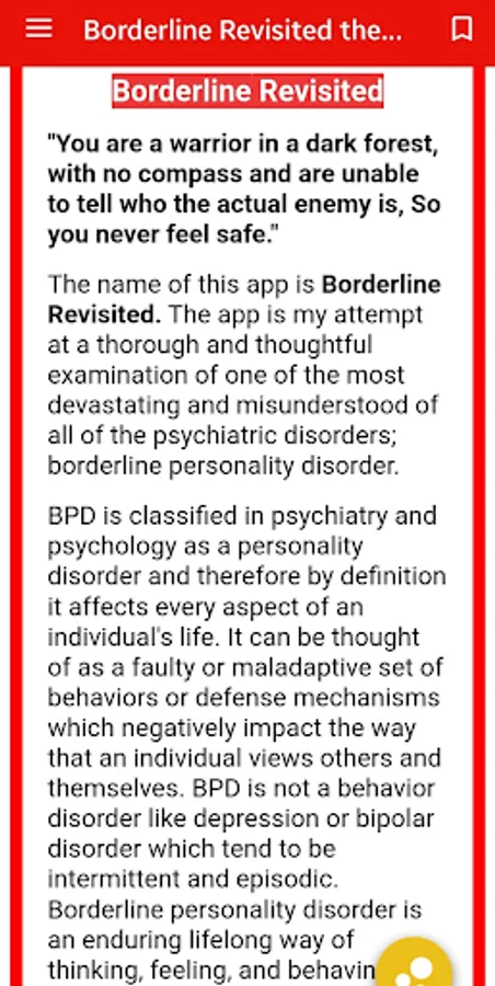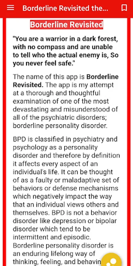 The app will provide in depth information on all aspects of borderline personality disorder including the symptoms, traits, possible causes, complications of the disorder, coping strategies, treatment options, as well as personal stories from those who treat BPD and those who are battling BPD.