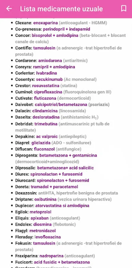 - the chapter on medicines - this chapter in medicine being a very vast one, we considered it important to have as simplified a structure as possible for the classes of medicines. As there are other applications that provide complete information about dosage, administration, adverse effects, etc., we tried to offer what is missing or what we would have liked to have at the beginning of the journey. It is very useful to have all the commercial names of a medicine at hand (some schemes can be more difficult to load, so you may have to wait a few seconds until they appear on the screen). Other commercial names that still exist, in addition to the international common name or the active substance itself (eg. Clindamycin is also found under the commercial name of Clindamycin in addition to the commercial names written in purple, even if it is not and she with purple). The part of the leaflets is strictly informative, because there can be differences in the leaflet of the same drug but produced by different companies, and also differences between the leaflets of the same drug from the same company but of different concentration. That's why consult exactly the leaflet of the medicine you are prescribing. We introduced a single leaflet per pharmaceutical form and concentration as a model.