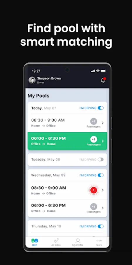 Carpool Matching: Hop to Work intelligently matches employees with similar commuting routes, maximizing carpooling opportunities and reducing traffic congestion.