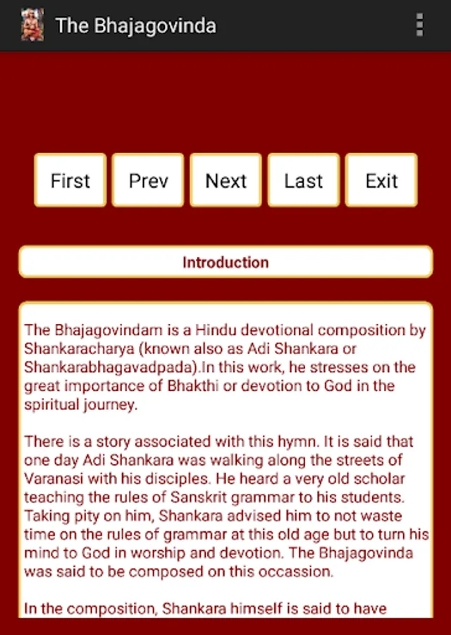 The Bhajagovindam is a Hindu devotional composition by Shankaracharya (known also as Adi Shankara or Shankarabhagavadpada).In this work, he stresses on the great importance of Bhakthi or devotion to God in the spiritual journey.